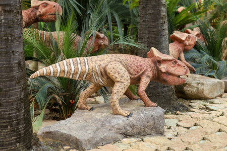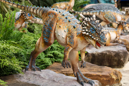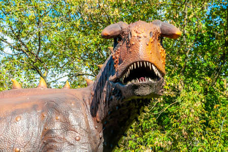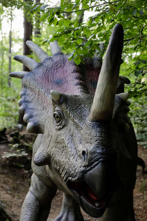 Rasnov, Romania - October 3, 2020: Details with a Styracosaurus dinosaur model at an outdoors dino park in Romania.
