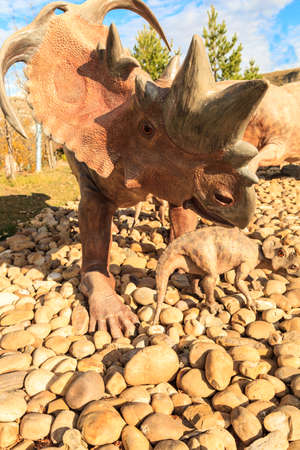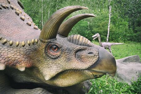 Triceratops huge dinosaur of the Jurassic era walks in forest in summer on a sunny day. A wild lizard grazes in the dino park for children. The life of predators in the wild. Models at the exhibition.