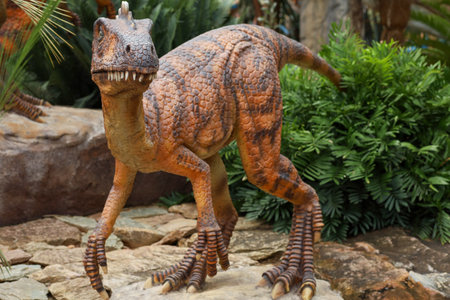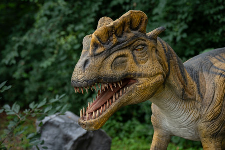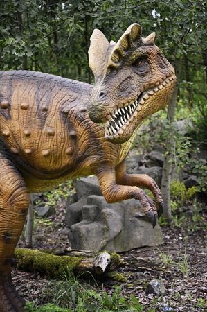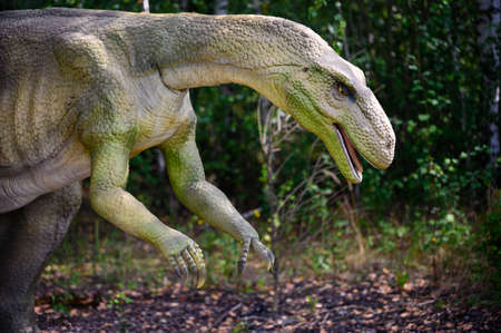 Big model of prehistoric dinosaur in nature. Realistic scenery.