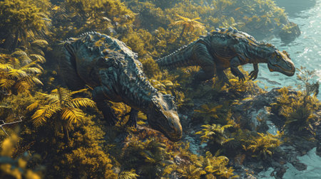 Dinosaurs in a fantasy landscape with lush greenery. 3D render.