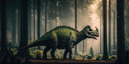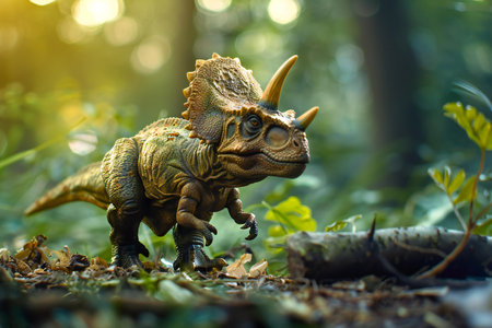 Triceratops dinosaur model on the forest floor in the evening