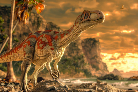 Realistic Dinosaur Figurine in a Lush Prehistoric Landscape with Ocean Background at Sunset AI Generative