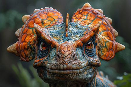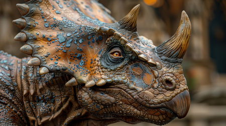 Highquality closeup of a detailed dinosaur model head, showcasing realistic textures and colors