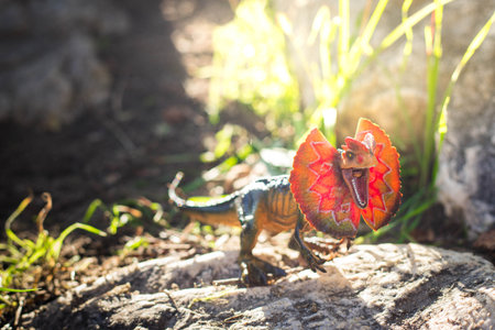 Miniature dinosaur toy, dilophosaurus, in natural outdoor setting with grass and rock. Background with copy space and sun flare.
