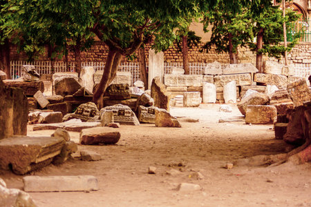 Alexandria, Egypt - November 03, 2021: Ancient Exhibits in the Alexandria National Museum - Marble and Stone Statues, Books, Medieval Decoration and Roman Tableware
