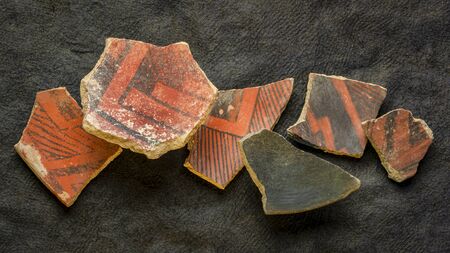 ancient Native American Indian (Anasazi) artifacts, several pottery fragments on a dark paper background with a copy space