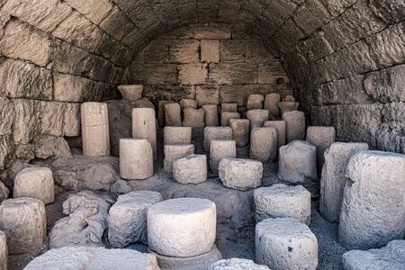 Chunks of antique Greek columns stored in basalt cavern, Rhodes, Greece. Royalty free stock photo.