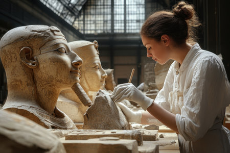 A skilled restorer carefully works on ancient Egyptian sculptures in a museum with natural light filtering in.