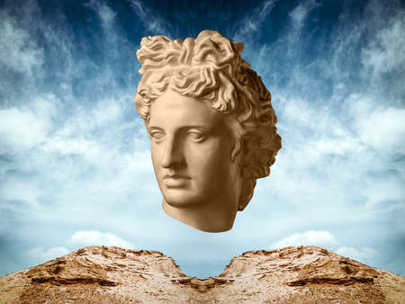 Surreal modern conceptual art poster with ancient statue face of Apollo and sky. Collage of contemporary art.