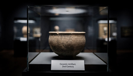 Medium shot featuring an isolated ceramic artifact inside a sleek glass showcase with label text and surrounding exhibit softly out of focus against an elegant dark environment.