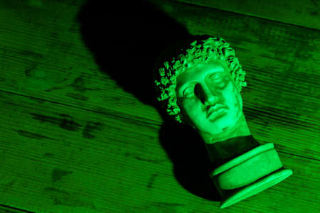 Plaster bust of ancient statue Hermes head in a green neon light. Ancient greek sculpture Hermes head on wooden boards. Minimal art fantasy concept. Copy space