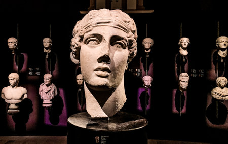 Alexandria, Egypt - November 03, 2021: Ancient Exhibits in the Alexandria National Museum - Marble and Stone Statues, Books, Medieval Decoration and Roman Tableware
