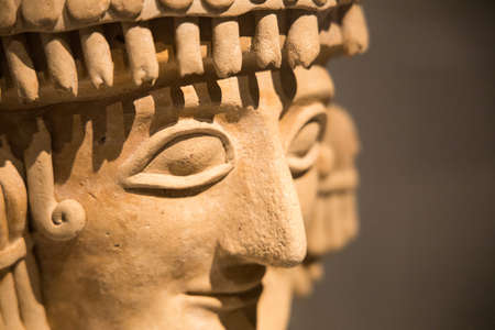 Leiden, The Netherlands - JAN 04, 2020: closeup of statue of the head of a woman made from terracotta from ancient Cyprus. From 625-600 BC, Agios Georgios Rigatos.