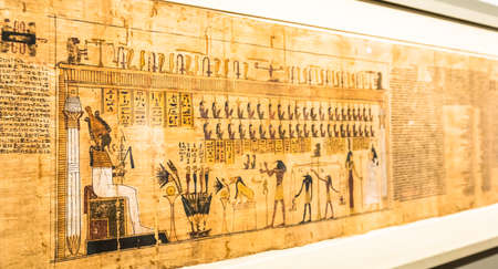 TURIN, ITALY - CIRCA MAY 2021: ancient Egyptian papyrus with hieroglyphic funerary text. Circa 1550 BC antique manuscript.