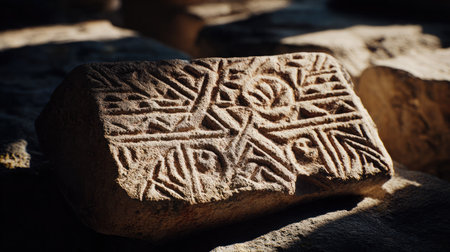 A close-up view of an ancient stone carving showcasing intricate patterns and textures illuminated by soft natural light, highlighting its historical significance.