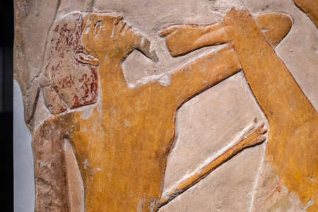 Cairo, Egypt - November 02, 2021: Interesting Ancient Paintings and Engravings with Hieroglyphics symbols in the Cairo Egyptian Museum, the oldest archaeological museum in the Middle East
