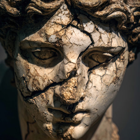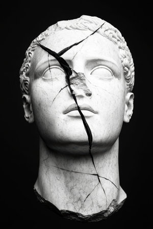 Cracked marble bust with a pensive expression