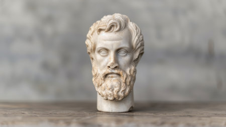 This striking image showcases an ancient Greek bust adorned with a laurel wreath, highlighting its intricate details and historical significance.