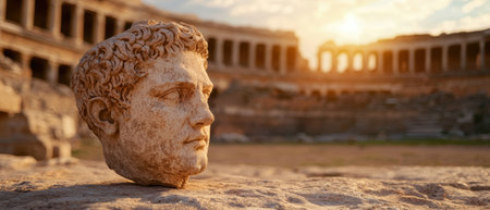 Ancient Roman head sculpture in front of ruins.