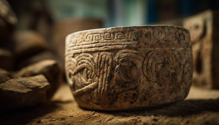 This captivating image showcases an ancient ceramic pot featuring intricate patterns and rich textures. Ideal for culture and art themes.