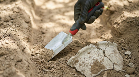 A close-up shot of an archaeologist wearing a glove, using a small trowel to carefully excavate a piece of ancient, broken pottery from the sandy soil of a historical site.