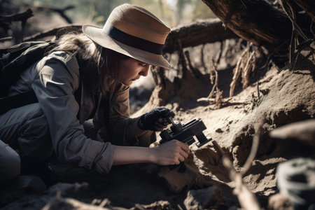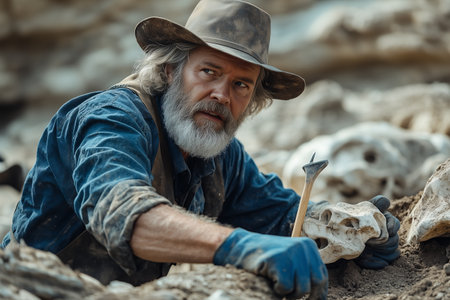 A dedicated and passionate paleontologist is meticulously uncovering ancient fossils in a rocky landscape. Generative AI
