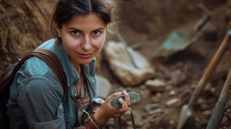 photorealistic image of a female Caucasian archaeologist at an excavation site, showing a mixture of excitement and focus.