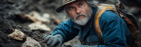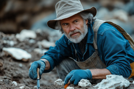 An elderly Caucasian male archaeologist is digging for artifacts at a work site.
