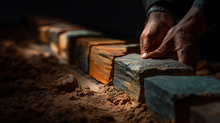 A work scene depicting construction materials including bricks, tools, and pillows on sandy ground. Ideal for illustrating craftsmanship and building activities.