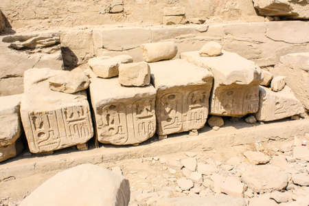 Karnak temple complex in Luxor, Egypt. Ancient stones with hieroglyphs with the name of pharaoh.