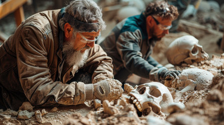 Captivating view of archaeological excavation featuring ancient skeleton remains and tools, revealing insights into human history and culture.