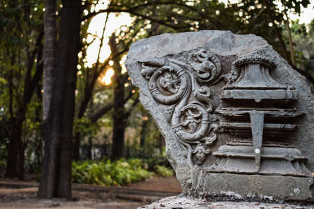 Stock photo of Ancient ruined archeological sculpture depicting Indian culture and traditions, stone kept in the garden area at Kolhapur, Maharashtra, India. focus on object. blur background.
