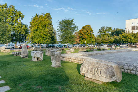 Zadar, Croatia - Aug 13, 2020: Roman relic stone at old town square in early morning