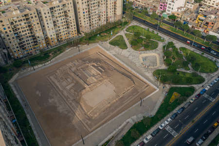 Lima, Peru - February 05, 2021: Aerial view of Huaca archeological site in San Miguel disctrict. Ancient pre-inca ruins in the middle of an urban city.