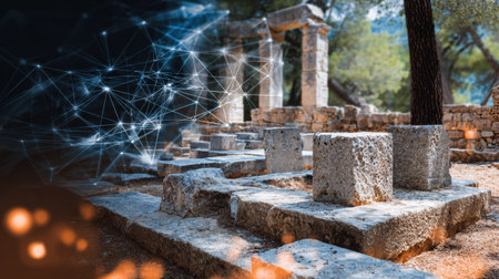 This scene combines an ancient stone foundation with digital data systems to reflect the connection between history and modern technology.