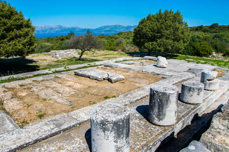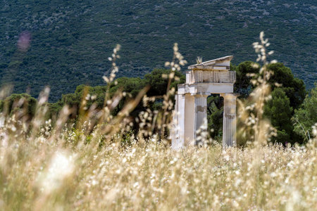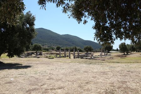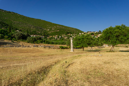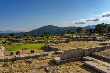 Messini, Greece - June 20 2021: Ruins in the Ancient Messene archeological site, Peloponnese, Greece. One of the best preserved ancient cities in Greece with visible remains dating back further than the 4th century BC.