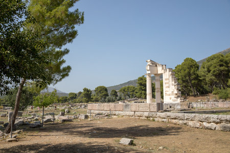 Epidaurus, Greece - September 2, 2024: View of a row of standing ancient columns and partial colonnade structure at the Sanctuary of Asclepius, with scattered stone blocks in the foreground and hills with trees in the background under a clear blue sky.