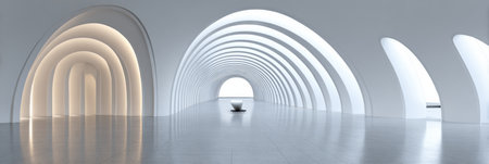 A spacious indoor area features elegant curves and arches, creating a serene atmosphere. Soft lighting enhances the minimalist design elements and open layout.