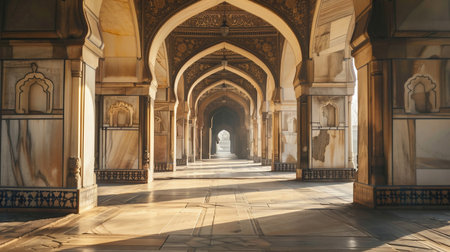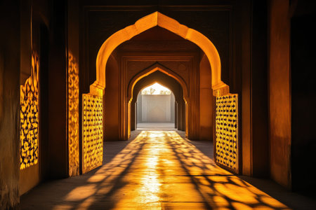 Discover the beauty of an ancient palace interior bathed in soft golden light, showcasing intricate arches and serene shadows that create a tranquil atmosphere.