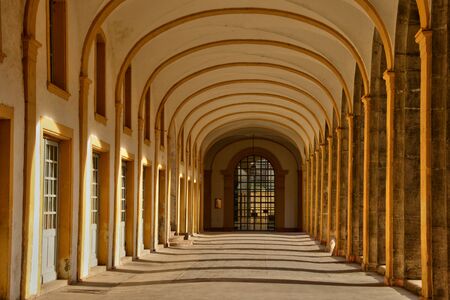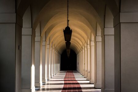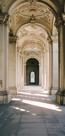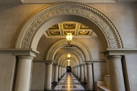 Luxury corridor with arches and columns illuminated by the sun