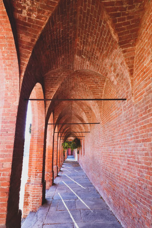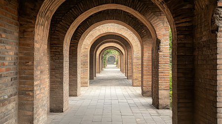 Explore a tranquil pathway lined with elegant brick archways. This serene corridor invites visitors to immerse in its historic beauty and architectural charm.