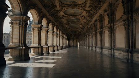 Grand hallway with high ceilings and arched doorways. Generative AI.