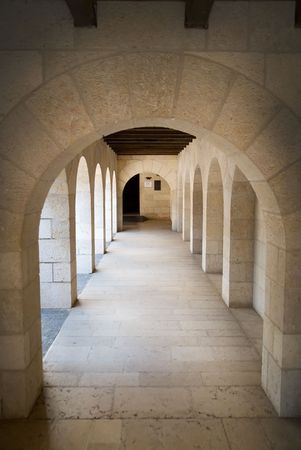Arches showing endless arches of stone in a sunlit corridor with dramatic shadows keywords: architecture, arch, arcade, corridor, building, stone,...