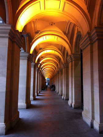 Dark, arched colonnade hallway