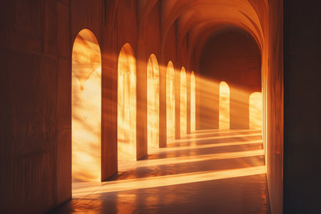 Sun rays shining through arches in a hallway, creating a dramatic light effect, Explore the use of negative space to play with light and shadow in your composition