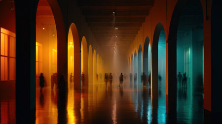 A captivating gallery scene features vibrant color lighting casting dramatic shadows on polished floors, creating a surreal artistic atmosphere.
