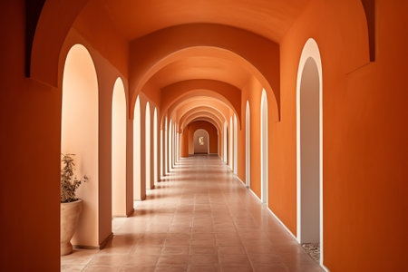 Orange arches brighten a smooth corridor, created by AI