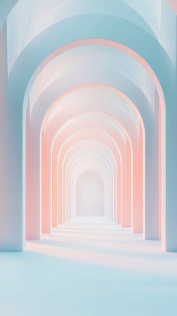 Explore a serene pathway of archways blending soft pink and blue tones. This artwork evokes tranquility and elegance perfect for inspiring creativity and calm.