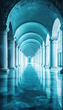 Perspective of Empty Blue Hallway With Columns, Symmetrical Architecture, Long Arched Corridor