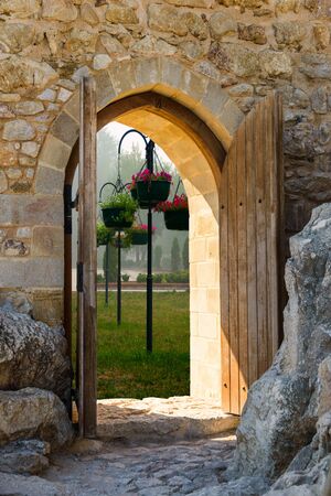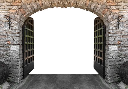 Old mystery wooden door to the underground vinery from the inside. Dark vintage inside walls and open doors isolated outside view.